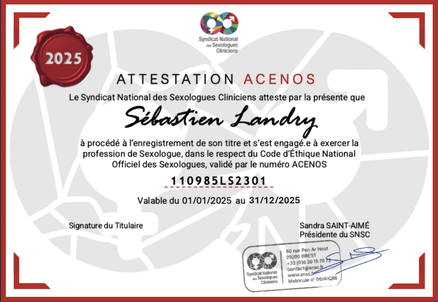 Bonjour et bienvenue sur mon site ! Je m'appelle Sébastien Landry, je suis Sexologue Clinicien, j'ai été formé à l'Ecole de Psycho-Sexologie à Paris. J'ai deux spécialités : les pathologies chroniques et la clinique des violences sexuelles.
